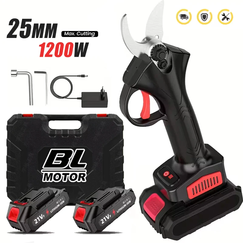1200W 25mm Brushless Cordless Electric Pruner Pruning Shears Fruit Tree Bonsai Pruning Branches Cutter Power Tool With 2 * Battery