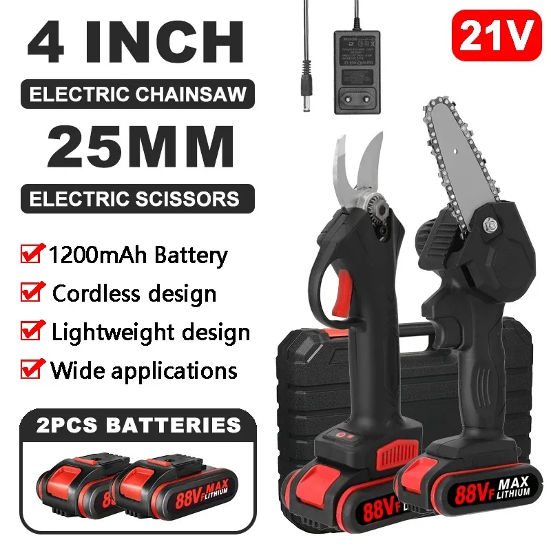 21V 25mm Cordless Brushless Motor 88VF Electric Pruning Shear 4inch Brush Motor Cahinsaw Set Woodworking Tool for Garden Orchard