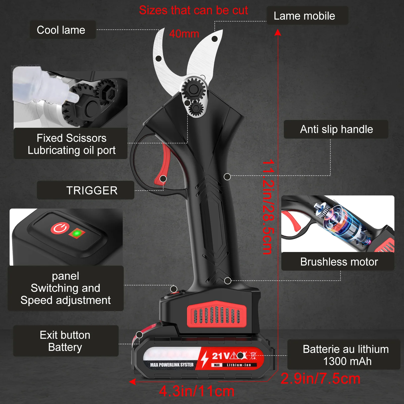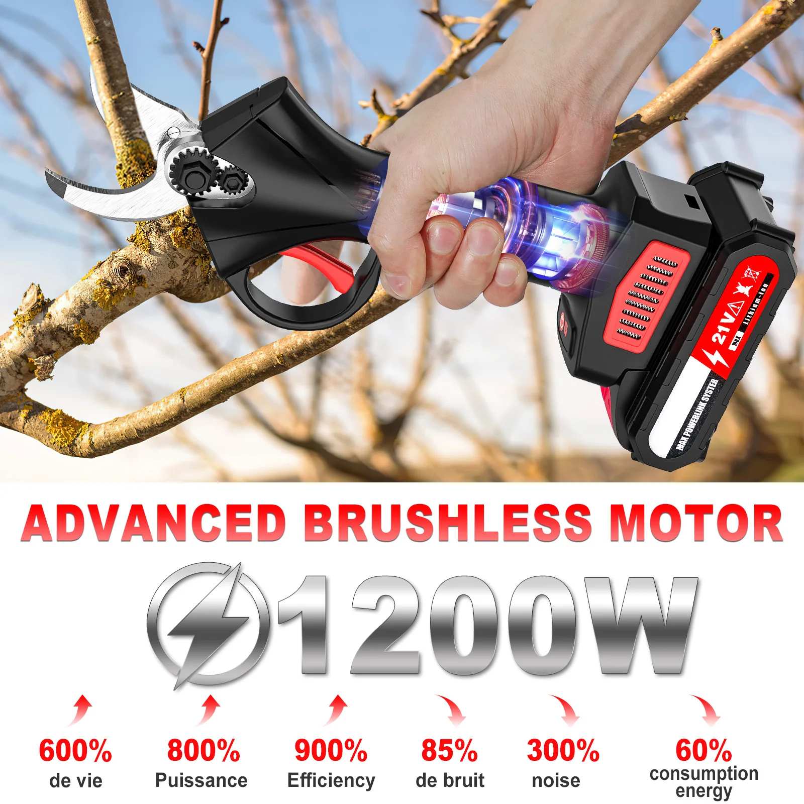 1200W 25mm Brushless Electric Pruner Pruning Shears Fruit Tree Bonsai Pruning Branches Cutter Power Tool With 2pcs Battery