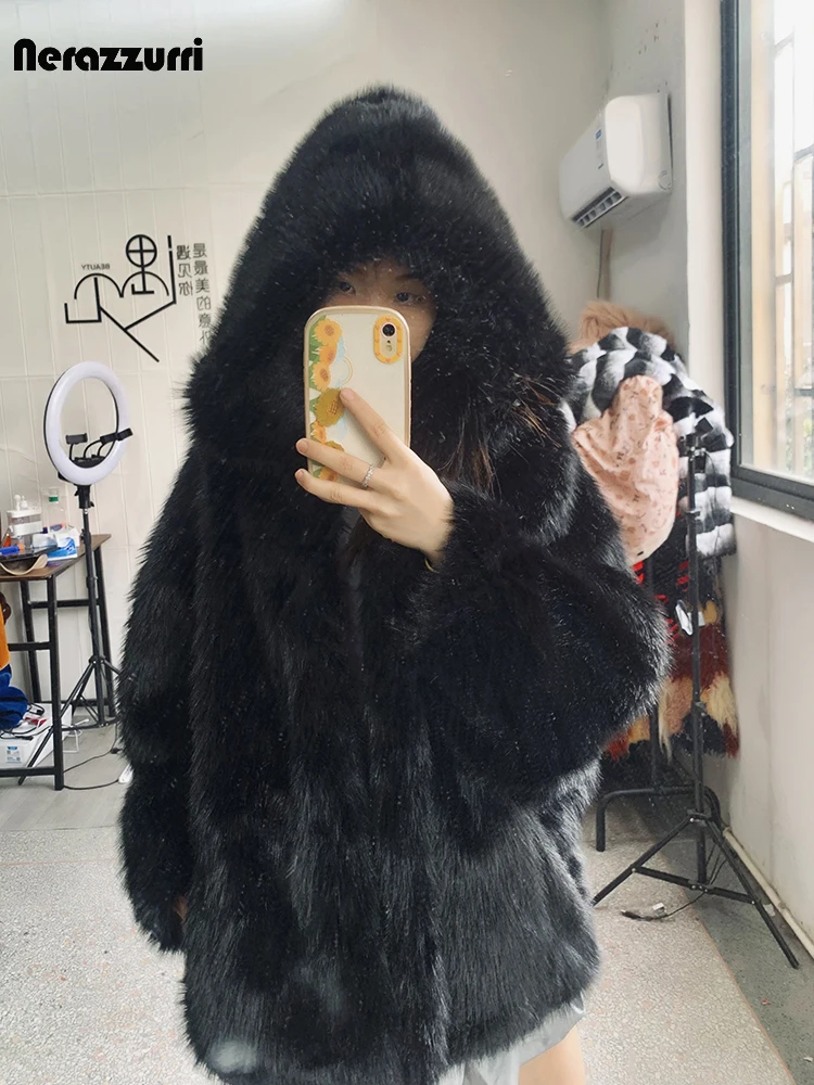Nerazzurri Autumn Winter Oversized White Black Warm Shaggy Hairy Faux Fur Coat Women with Hood Loose Casual Fluffy Jacket 2023
