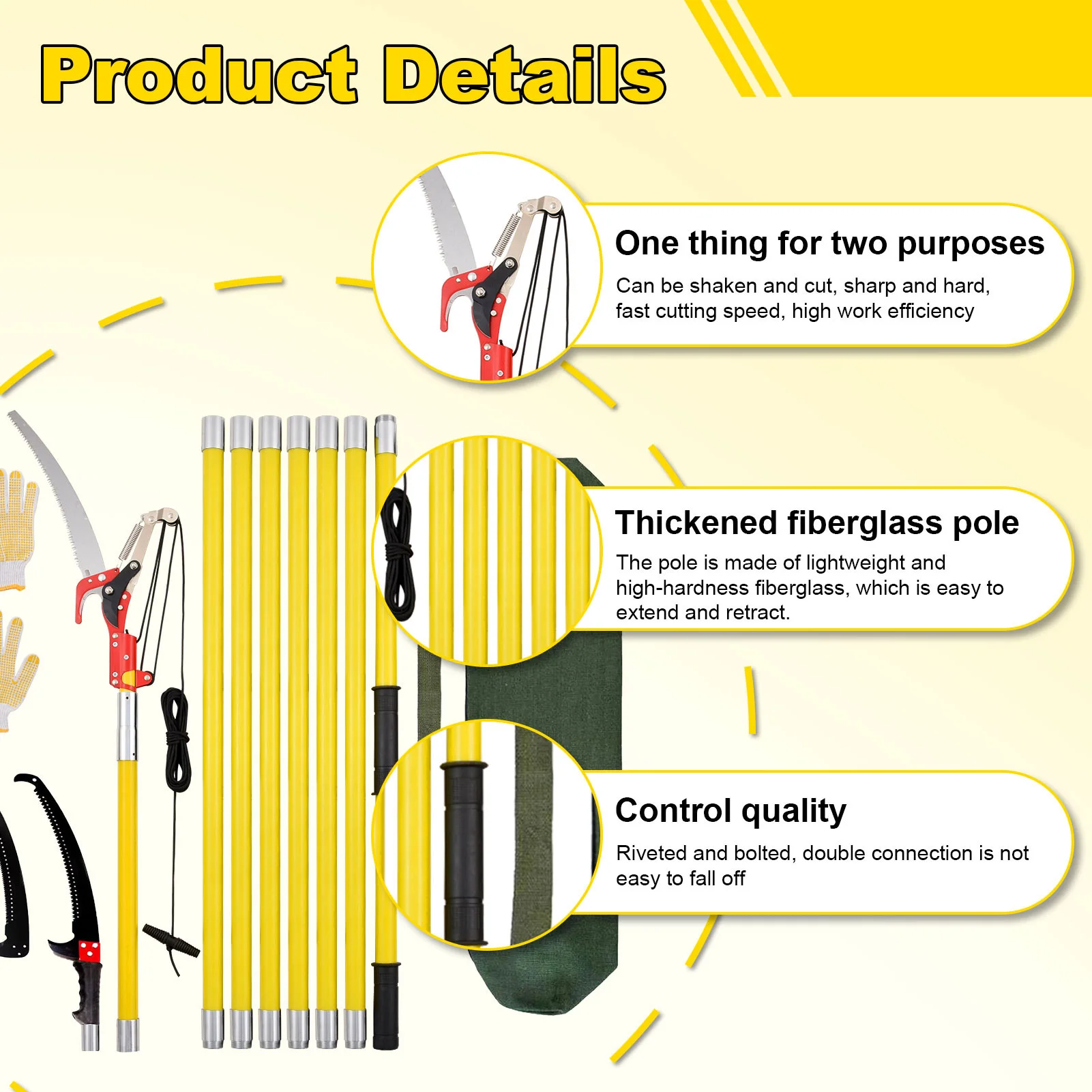 Our tree pruner pole saw is made of high-quality alloy steel cutter, ensuring high load capacity as well as smooth and fast cutting. You can easily adjust its length for pruning the leaves of palm trees and fir trees, making trimming a breeze. Perfect for any gardening enthusiast looking to an ideal tree pruner pole saw.